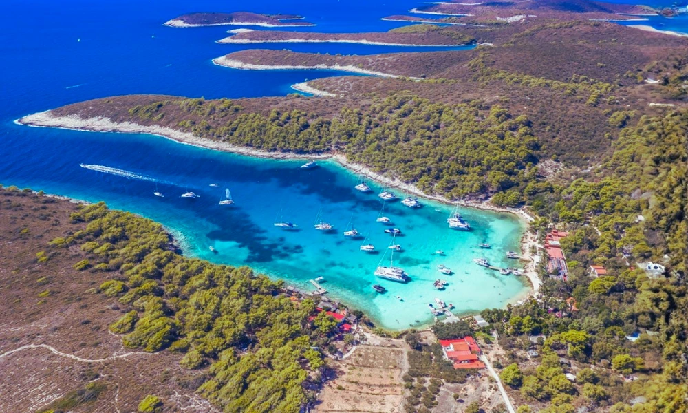 Aerial view of the Pakleni Islands near Hvar, showing turquoise bays, sandy shallows and white-sand coves filled with sailboats.